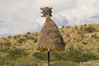 While travelling towards and out of Upington on my way to Kgalagadi, I was fascinated by numerous nests of Sociable Weavers in all shapes and sizes on telephone poles and other structures. Inside the park, the giant nest were seen on old huge trees.It was an interesting characteristic feature of the arid landscape. (Right click the image to enlarge)